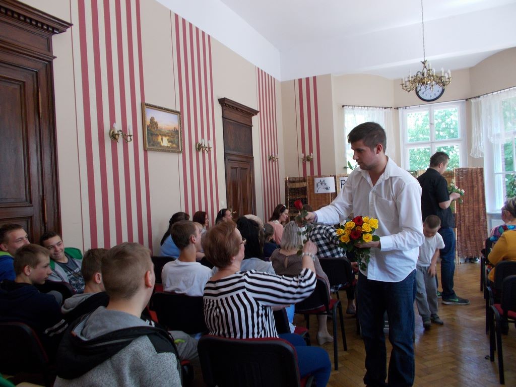 Kolejnym elementem uroczystości był tradycyjny już turniej pod hasłem “Kocham Cię Szkoło”. W formie kilku zabawnych konkurencji wszyscy mieli okazję spędzić czas inaczej niż tylko w szkolnych ławkach czy zajęciach praktycznych. Konkurencje sprawdzały u kadry znajomość Parków Narodowych, ortografii oraz znajomości uczestników Ośrodka i Szkoły, ponieważ jedna z konkurencji polegała na odgadnięciu po opisie, o którym z wychowanków mowa. Kadra mogła również wykazać się sprytem i refleksem grając w ulepszoną wersję muzycznych krzeseł oraz zaprezentować swoje talenty aktorskie pokazując scenki z Ośrodkowej i Szkolnej codzienności. Tego dnia młodzież miała okazję podziękować kadrze wychowawczej i pedagogicznej za trud wkładany w kształcenie i wychowanie. Na zakończenie uroczystości uczestnicy wręczyli własnoręcznie wykonane upominki oraz składali życzenia pomyślności, cierpliwości i sił w wykonaniu swoich zadań. Podziękowania kadra usłyszała również ze strony Kierownika Ośrodka, p. Agnieszki Piasek, która życzyła cierpliwości i kreatywności w podejmowanych działaniach. Dyrektor Szkoły, p. Mariola Kozłowska, natomiast życzyła kolejnych ciekawych inicjatyw realizowanych przez młodzież, przy wspólnej pomocy pracowników Ośrodka i Szkoły.