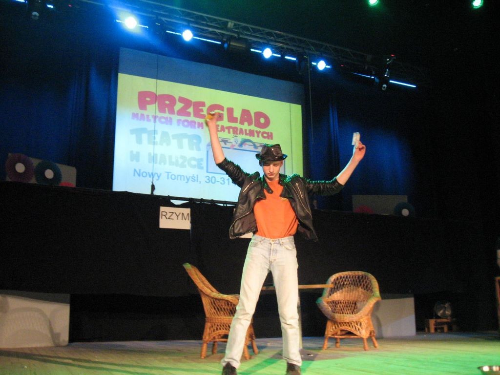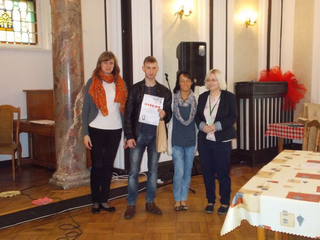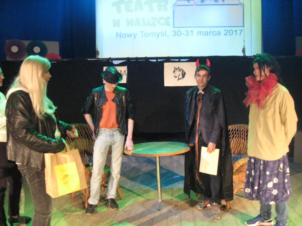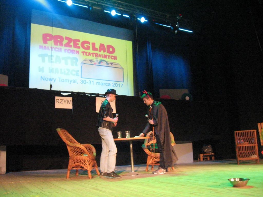 W miniony piątek uczniowie Niepublicznego Gimnazjum  i uczestnicy Ośrodka Szkolenia i Wychowania w  Chraplewie wzięli udział w przeglądzie małych form teatralnych pn. Teatr w walizce” ze spektaklem pt. „Pan Twardowski” . Scenariusz - bardzo współczesny został  oparty na balladzie Adama Mickiewicza pt. „Pani Twardowska” . W rolę Pana Twardowskiego  wcielił się Patryk Czapik, w rolę Czarta Ariel Goliński, a najważniejsze role odgrywał Krzyś Wicher ponieważ  wcielił się w barmana obsługującego Pana Twardowskiego oraz jego żonę, która to na postrach wystawiona tak przepłoszyła czarta, że zrezygnował z duszy Twardowskiego i zmienił profesję. Ważna także rola przypadła narratorowi, który w osobie Sebastiana Pyschnego budował nastrój przedstawienia. Przewodnicząca Jury Renata Knop stwierdziła, że grupa artystyczna z Chraplewa przedstawiła teatr antyczny, w którym mogli grać tylko  mężczyźni,  a gdy scena wymagała roli kobiety to przebierał się za nią także mężczyzna. Przedstawienie bardzo się podobało. Uczniowie ze swym spektaklem pod kierunkiem Pań polonistek Renaty Gmerek i Marioli Kozłowskiej  zajęli II miejsce w kategorii  młodzież. Aktorom gratulujemy.
