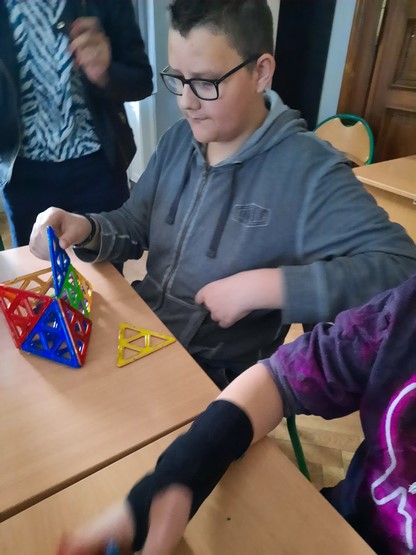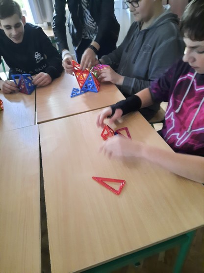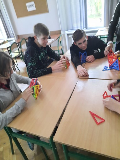 Na te pytania szukała odpowiedzi klasa VIII na ostatniej lekcji matematyki. Uczniowie przy pomocy magnetycznych figur geometrycznych tworzyli własne bryły, które następnie opisywali w zeszycie. Lekcja poprowadzona w ten sposób, pozwoliła uczniom na pobudzenie wyobraźni i utrwalenie wiedzy dotyczącej brył.