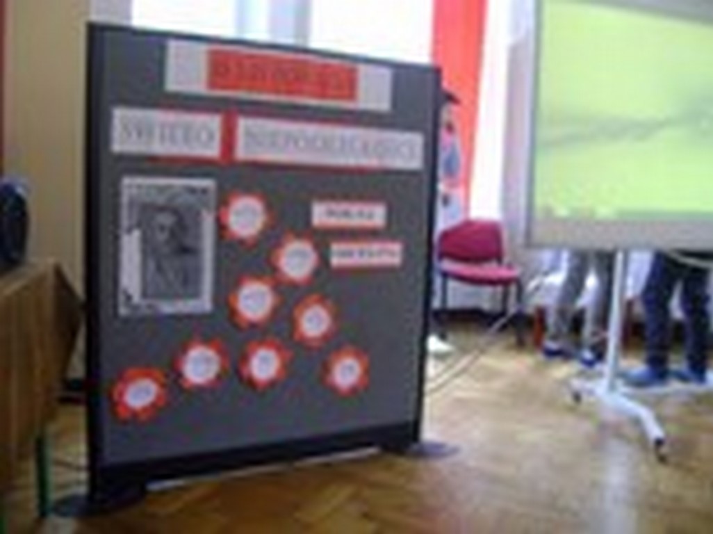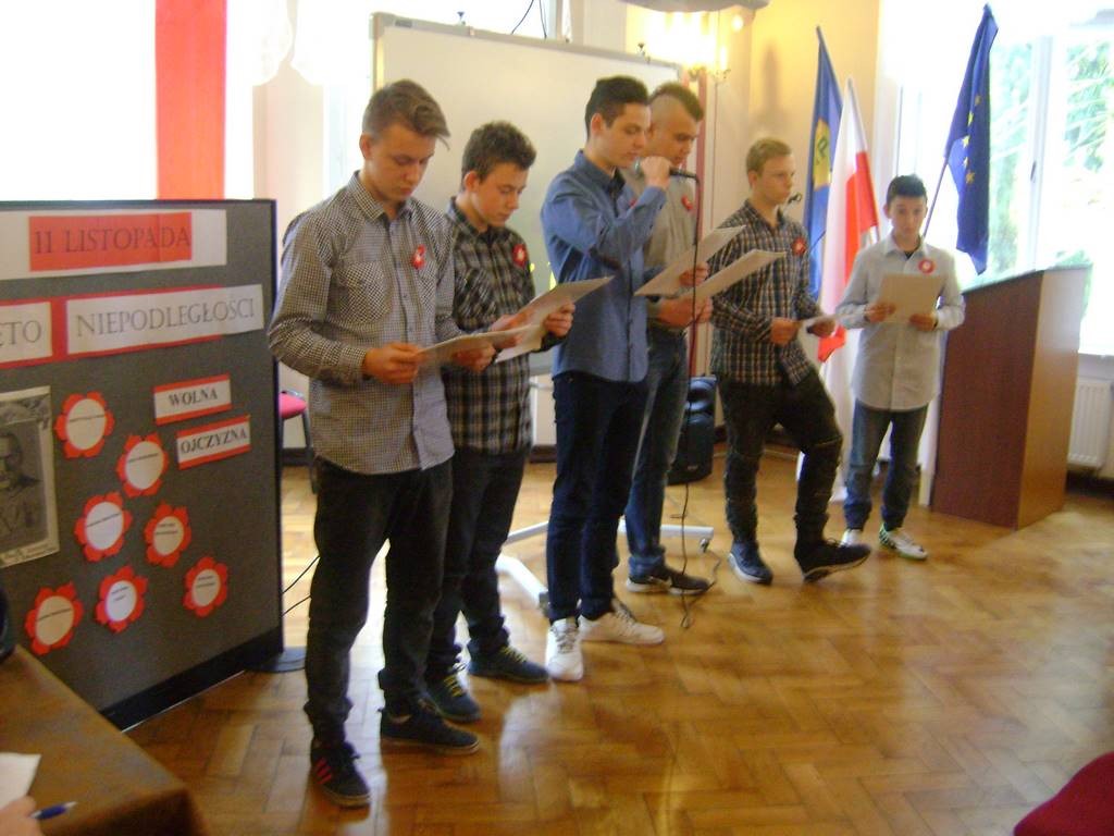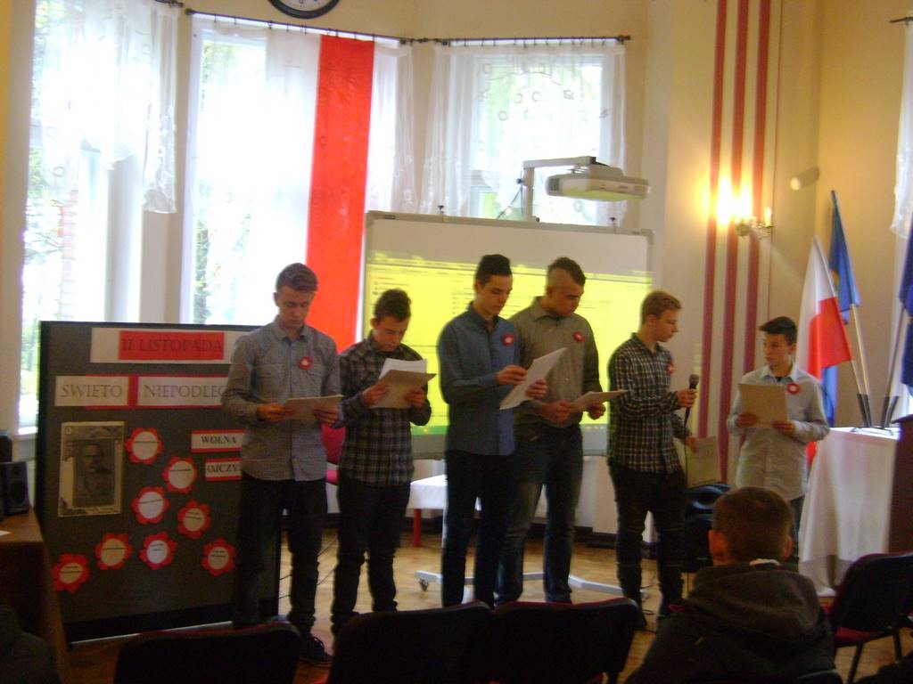 11 listopada - to tego dnia czcimy i upamiętniamy wspaniałe braterstwo, waleczność i męstwo naszych przodków. W obchody tak ważnej dla Polaków uroczystości włączyła się młodzież z naszej szkoły. Uroczystość rozpoczęła się od wspólnego odśpiewania Hymnu. Następnie uczniowie przystąpili do konkursu, w którym musieli wykazać się znajomością pieśni patriotycznych i wiadomościami nt. wydarzeń z okresu poprzedzającego odzyskanie niepodległości, a także znajomością zasad udzielania pierwszej pomocy.  Tego dnia również miało miejsce podsumowanie konkursu plastycznego "Wolna- niepodległa". Wśród zwycięzców znaleźli się Mateusz Sosna, Sergiusz Bączyk, Filip Sołtysik oraz wyróżnienie otrzymał Jakub Pajtak. Gratulujemy nagrodzony. Organizatorem przedsięwzięcia była Joanna Białek.