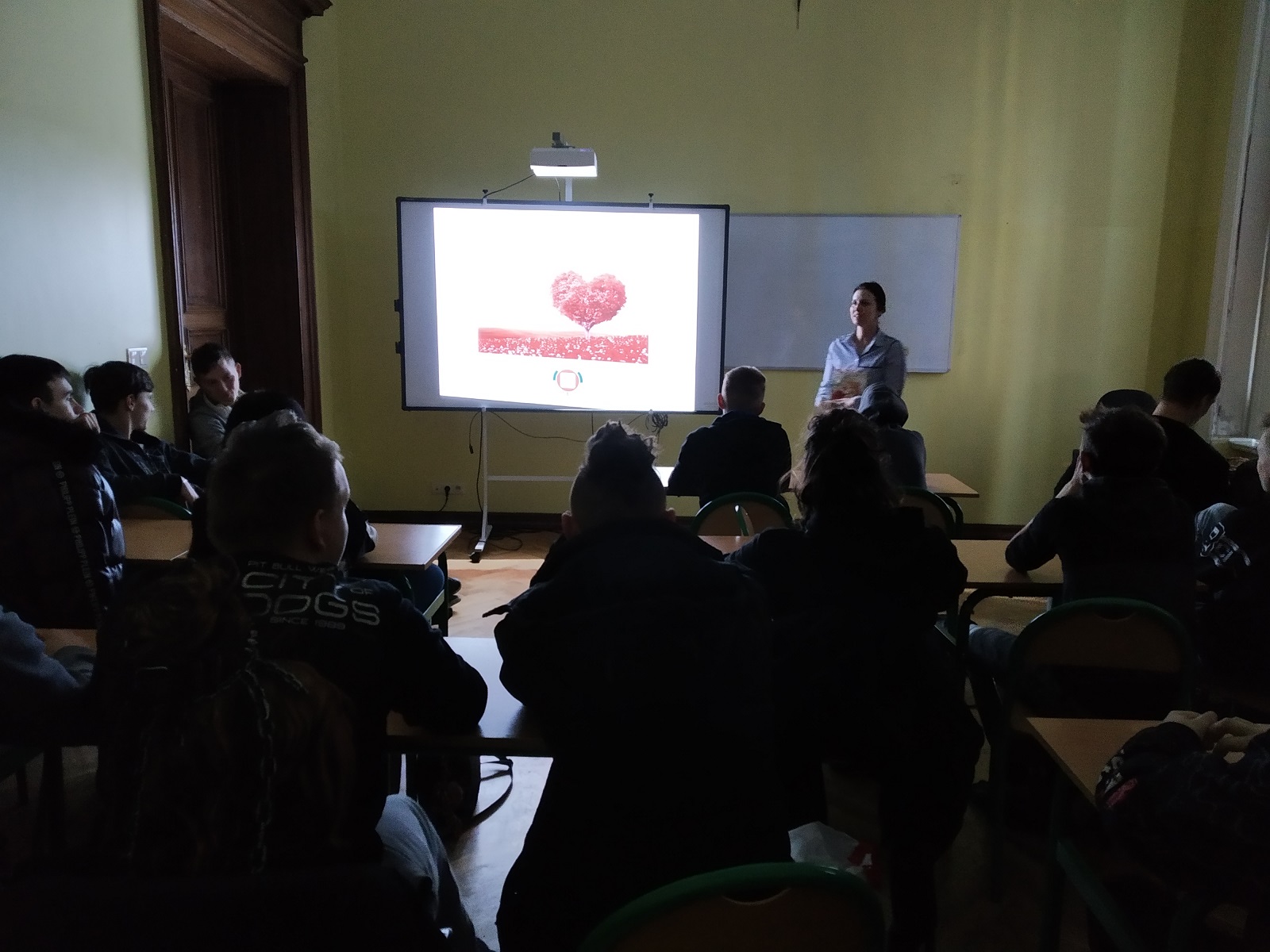 W dniu 13 lutego uczniowie wzięli udział w z zajęciach profilaktycznych prowadzonych przez Powiatową Stację Sanitarno- Epidemiologiczną w Nowym Tomyślu. Zajęcia nosiły tytuł "Bezpieczne Walentynki". Spotkanie dotyczyło profilaktyki zachorowań HIV i ADIS. Prelekcja bardzo zainteresowała młodzież, zadawane były mądre pytania, które przyczyniały do dyskusji. Tego rodzaju zadania przyczyniają się do zmniejszenia zachorowań na ADIS i poniesienia świadomości młodzieży na temat HIV i ADIS.
