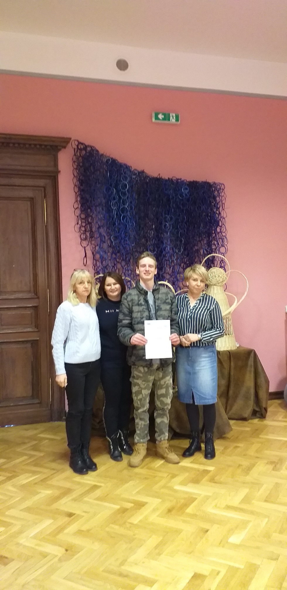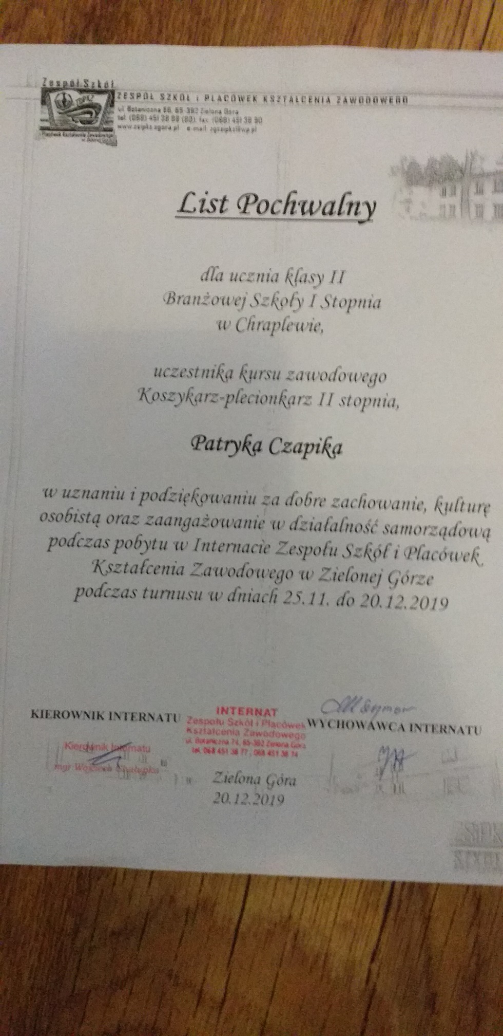Dnia 15 stycznia br. odbył się uroczysty apel, na którym dyrektor szkoły- Mariola Kozłowska i kierownik OSiW w Chraplewie - Agnieszka Piasek  wręczyły list pochwalny (z Zespołu Szkół i Placówek Kształcenia Zawodowego w Zielonej Górze) uczniowi  klasy II Branżowej Szkoły I stopni- Patrykowi Czapikowi, który a w czasie pobytu na kursie zawodowym II stopnia w Zielonej Górze wyróżnił się nie tylko dobrym zachowaniem, ale przede wszystkim kulturą osobistą i zaangażowaniem w działalność samorządową.